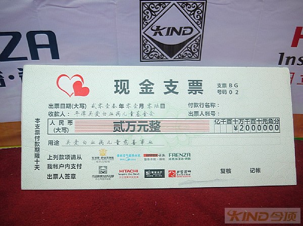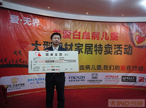 通过今顶集成吊顶、生活家巴洛克地板、欧派整体橱柜、法恩莎卫浴等品牌的号召力,加上福州业主对公益事业的积极响应,本次建材家居特卖活动取得圆满成功,并为平潭白血病儿童筹得20000元善款。在现场所有业主的共同见证下,特卖商家将标明“用于关爱白血病儿童慈善事业”用途的现金支票转交给了平潭县白血病儿童基金会。