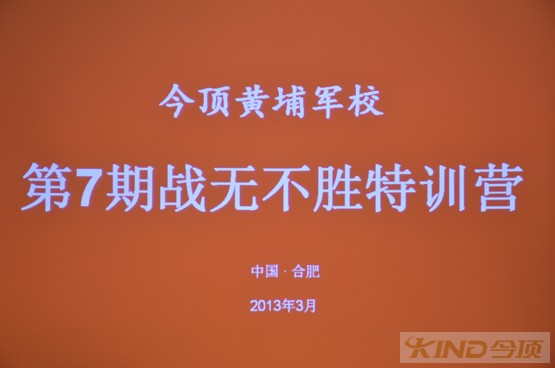2013年3月18日“今顶黄埔军校第七期战无不胜特训营”在安徽合肥召开。本次培训会汇集了今顶安徽战区经销商、店长、导购、今顶安徽战区团队、今顶虎豹组等成员,培训工作由今顶公司品牌运营部担任。这次针对特训营的培训课程安排了《今顶战无不胜赢利模式四部曲》、《胜者为王—今顶终端导购博弈指引》、《战无不胜—今顶产品策略及系统性卖点话术指引》等内容。