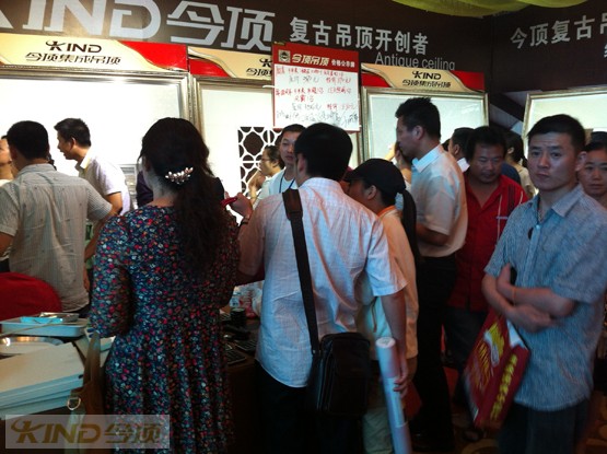 在家博会现场,今顶复古吊顶先后出了欧式复古、中式复古个3~4块样品供消费者选择,同时根据消费者的需求为消费者推荐电器的组合。值得一提的是很多业主对今顶“点睛系列”中再创辉煌表现了极大的兴趣,镜面板材配以白色雕刻,使之看上去尽显了欧洲的复古风风。在不断的有人咨询中今顶的各款产品都被到场业主赞不绝口。