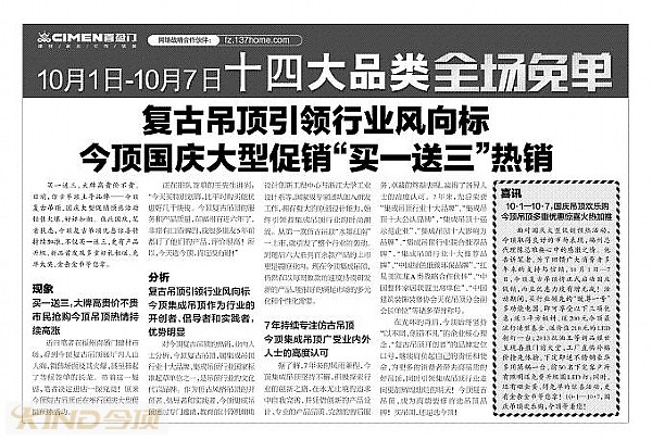 近日,《海峡都市报》发表了关于今顶复古集成吊顶福州专卖店国庆促销活动的文章《今顶复古吊顶引领行业风向标——福州今顶国庆大型促销“买一送三”热销》的报导。详文如下: