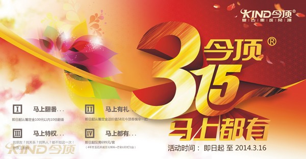 集成吊顶高端品牌,今顶复古吊顶日前全国三十二个省市自治区,十二大战区,已经全面进入2014年“3.15消费者权益日”促销活动的备战状态。这次是今顶“2014保一冲二·势不可挡”年度目标第一战,这一战各级战线人员均已做好一切准备,众多市场也已进入练兵、蓄水状态,接下来,今顶2014开山力作“今顶3.15马上都有”全国大型促销活动即将全面打响,详情敬请关注今顶官网:www.cnkind.com