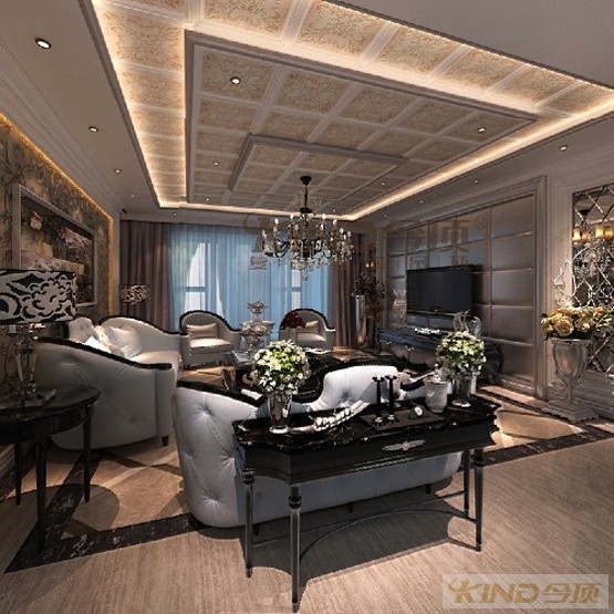 在将这款古典风格强烈的天花板块具体运用到家居时,设计师进行了一定的改造,将整个客厅空间采用三级错层的方式,周边搭配浅色板材及配套边条横梁,突出与中央地带的对比;并点缀以一盏豪华的水晶吊灯,充分营造出欧式奢华的感觉,将欧式风格展现得淋漓尽致。奠定了整体空间装饰的富丽堂皇,彰显出主人典雅非凡的生活品位。