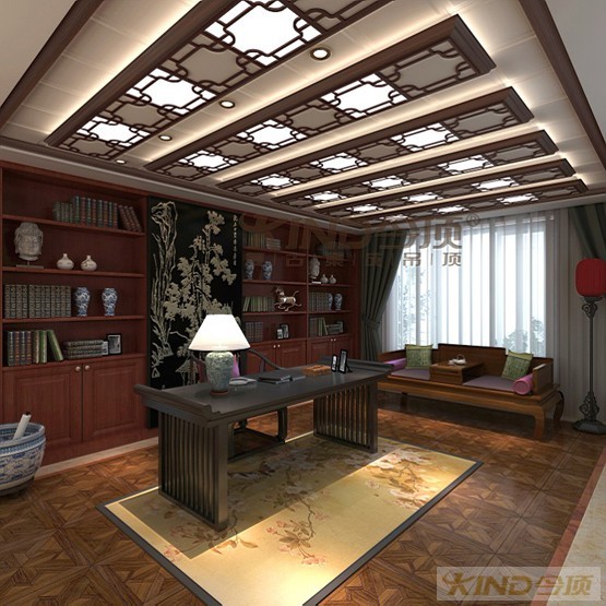 怀旧是一种情绪,也是一种时尚。旧物、故人、老家和逝去的岁月都能勾起我们的怀旧之情。静静地坐在书房里,一杯茶、一个午后就能让我们穿越时光,神游太虚,放松身心享受旧时光的惬意温馨。本期小编为您推荐两款复古风格的书房吊顶设计,带你进行一次穿越时光之旅。