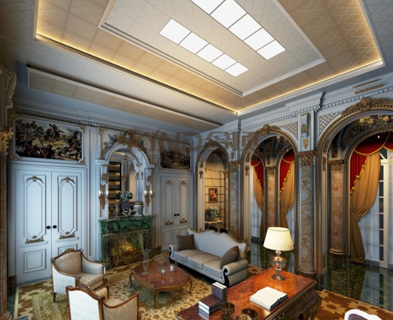 复古的书房设计有着无限安静的空间氛围,这样的静谧空间对于阅读者来说是一种享受,很多时候我们需要一次无人的打扰私人生活,让紧张的大脑有一个缓冲、休息的空间。优雅之态,从容流露。我们将空间运用至极致,配合巴洛克和洛可可式曲线优美、线条流动的家具陈设,使得中世纪的威廉古堡仿佛在你眼前重现般的精彩。墙面雕文刻镂黄白相间的板材色彩搭配复古花色的单人沙发椅,极其讲究造型,给人端庄典雅、高贵华丽浓厚文化气息