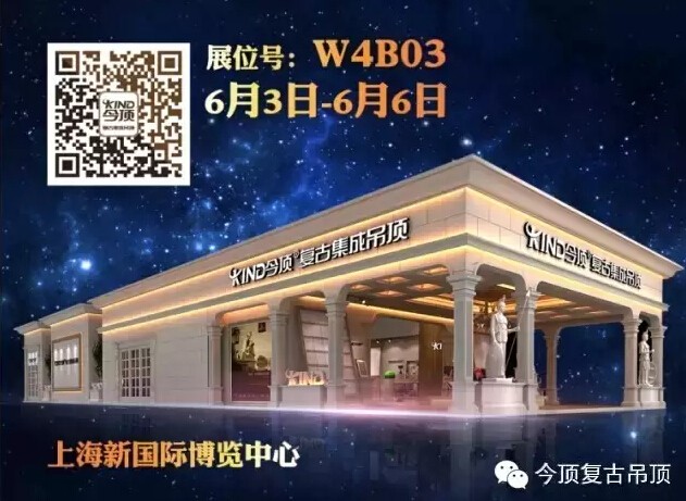 今顶复古集成吊顶即将参展“第20届中国(上海)国际厨房、卫浴设施展览会”,展会时间为2015年6月3日-6月6日,展会地点为“上海新国际博览中心”,在此,我们诚挚邀请社会各界朋友莅临今顶复古吊顶生活馆展位(W4B03)参观指导,共襄盛举!