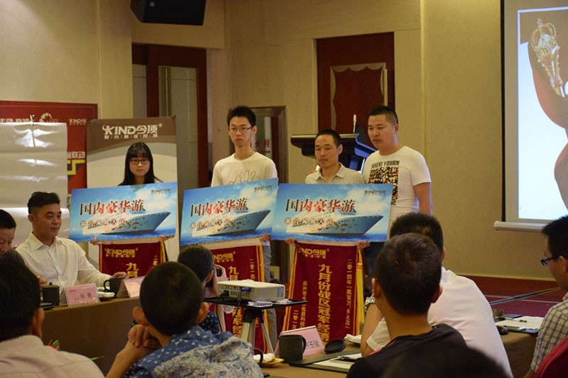 在钱总简短致辞后,会议进行2014年“赢百万,开大店”活动获奖经销商颁奖仪式。苏州今顶、张家港今顶、太仓今顶、涟水今顶、南通今顶、无锡今顶、济宁今顶、泗阳、仪征、墟沟等10个地区经销商分别获得至尊客户,金尊客户,优秀客户,9月冠军战区荣誉。