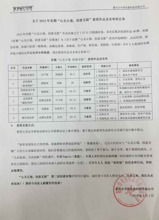 2015年首届“心无止境,创意无限”征集案通过各部门努力已圆满结束,为表彰提供优秀创意并转化为公司即战力的员工,同时激励全体员工在下一届活动中更加踊跃,进一步加强企业创新文化建设,广开思路,激发潜能,鼓励创新,降耗增效,培养优秀人才,增强主人翁意识所举办。