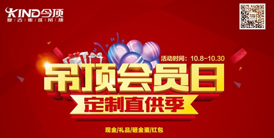十月装修旺季之时,今顶复古集成吊顶全国1000多家专卖店将同期开展,10月“吊顶会员日”定制直供季促销活动,已如火如荼展开,与您共享今顶吊顶饕餮盛宴!