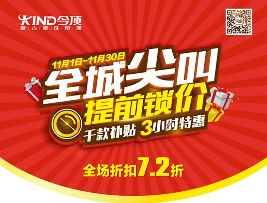 秋天快过去了,冬天还会远吗?在11月这个购物季,今顶复古集成吊顶全国1000多家专卖店将同期开展“全城尖叫,提前锁价”定制直供季促销活动!在冬日来临之前一起共享今顶吊顶优惠盛宴吧!