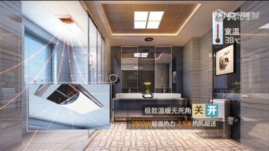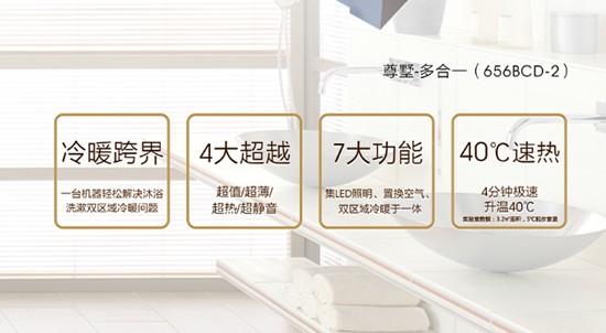 然而今顶对尊墅系列的精雕细琢,远不仅如此。尊墅(656BCD-2)还运用了行业领先的复式循环加热技术,2.5m的超远送风距离,保证浴室空间4分钟加热到40°C(3.2㎡,5℃),快速暖房,无需漫长等待。同时,尊墅(656BCD-2)采用双向风轮技术,做到换气/吹风的自由切换。考虑到梅雨季节室内空气潮湿容易滋生细菌,尊墅多合一还专门设置了干衣干房功能,当沐浴结束时可以开启干衣干房模式对室内空气进行高温杀菌或烘干衣物。
