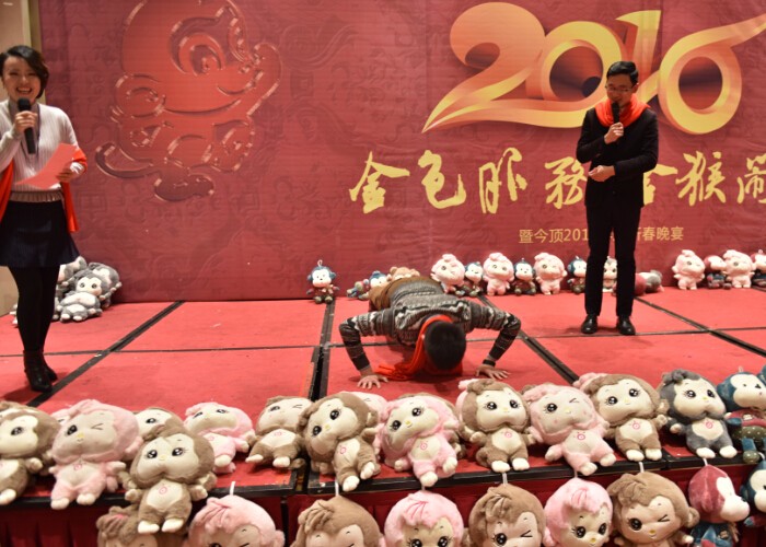 四位主持人伴着年会激昂的音乐迈上舞台,开始了2016今顶“金色服务,金猴闹春”年会第一场微信互动游戏