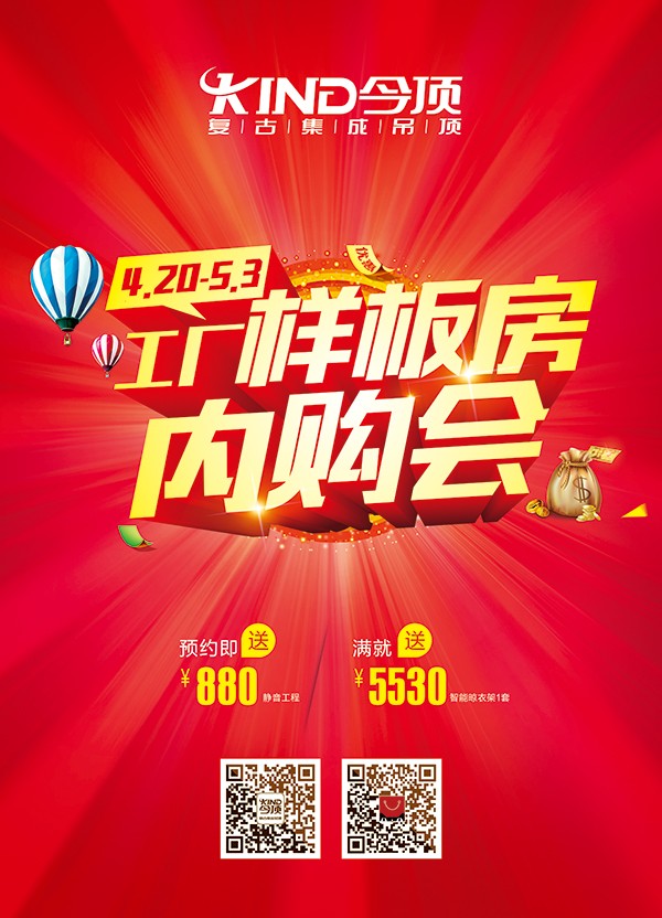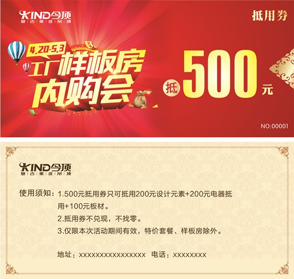 “今顶吊顶美哒哒,预约工厂内购样板房成功啦“,下单即送500元抵用券(200元设计元素抵用券+200元电器抵用券+100元板材抵用券。抵用券不兑现,不找零,仅限本次活动期间有效,特价套餐、单品等除外