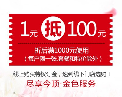 1元抵100元;今顶天猫旗舰店拍1元特权订金,线下可抵100元(需折后满1000元,每户限1张,套餐和特价除外)