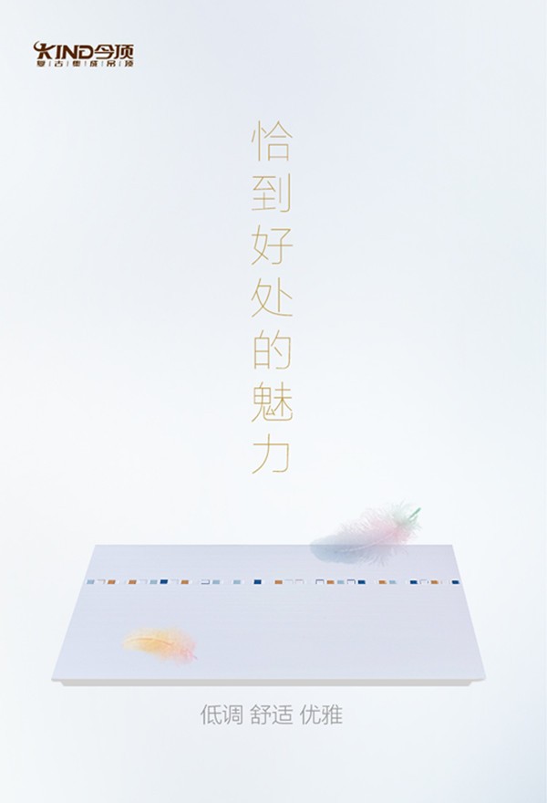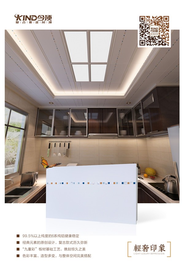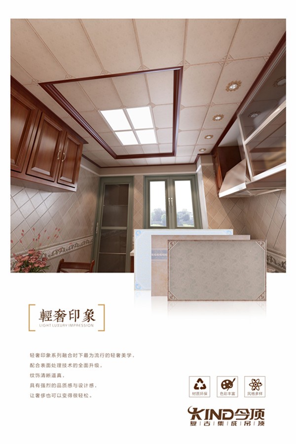 本次“轻奢印象”系列是2016年今顶集成吊顶春季新品“尊雅系列”持续性延伸产品。依旧采用今顶集成吊顶独特氧化及丝印工艺,抗紫外线、色彩均匀一致、纹理清晰逼真、不褪色,健康环保!独具特色的是将板材拉长,300*485全新出击,打破集成吊顶传统板材方正理念,让家的天空拼接有更多的选择,让消费者成为艺术的创造者。同时,本系列简约时尚轻奢华,配以花纹点缀,真实肌理纹路突显文化沉淀,在光的瞬息万变中揭示着自然界的奥妙,给人一种自然简约又复古的基调。