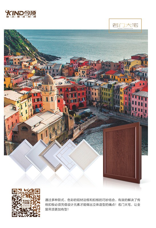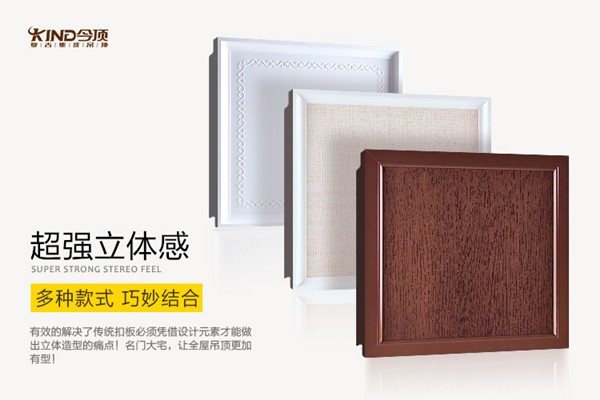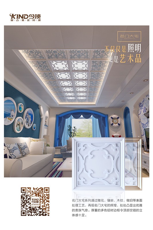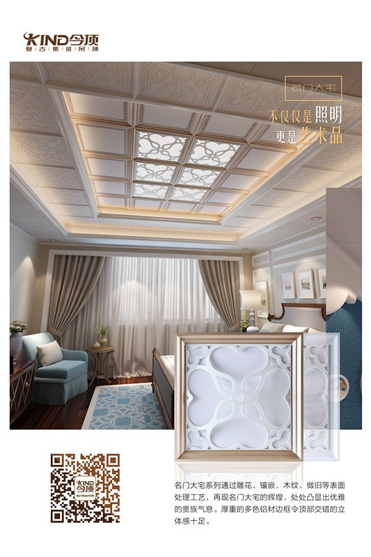 此次“名门大宅”系列,量身制定的关怀,彰显大家的精工品质。“名门大宅”系列奢华风范引领时尚前沿,白色及金色铝框,通过丝印工艺,呈现镌刻效果,色彩层次分明,使原本底板颜色更加逼真丰富。该工艺抗紫外钱、色彩均匀一致、不褪色、健康环保!边框凸形花架造型,搭配上微妙变化的灯光,让顶层的空间立体感跃然而上,设计律动感完美的展现出来。本系列根据市场需求,推出的板材和照明同系列搭配,让消费者的选择更加灵活多变。