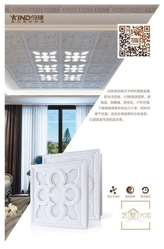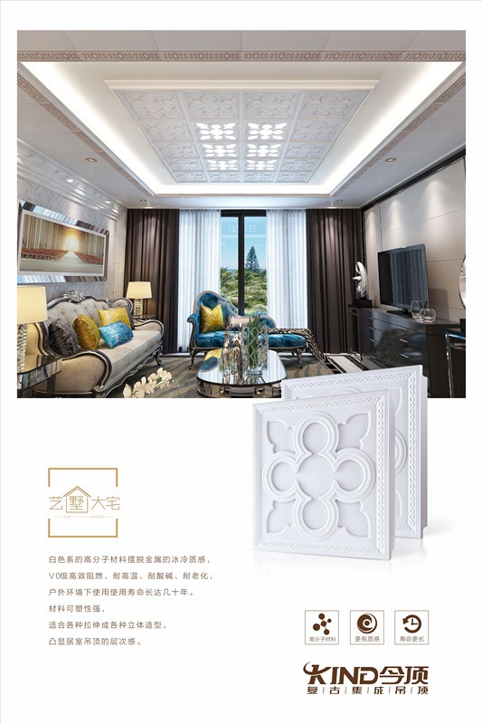 本次“艺墅大宅”系列春季新品面市,汲取欧洲古典建筑文化之精髓,尽显高端艺术品质。“艺墅大宅”系列采用新型环保高分子材料,白色系的高分子材料摆脱金属的冰冷质感,V0级高效阻燃,耐高温、耐酸碱、耐老化,户外环境下使用使用寿命长达几十年。材料可塑性强,适合各种拉伸成各种立体造型,凸显居室吊顶的层次感。同时,根据市场需求,延续“名门大宅”系列,推出板材和照明同系列搭配,让消费者的选择更加灵活多变。