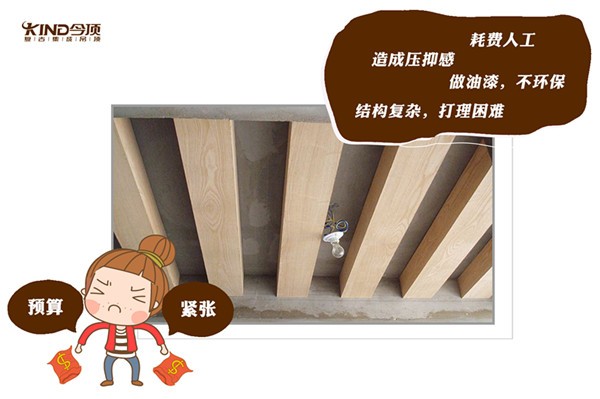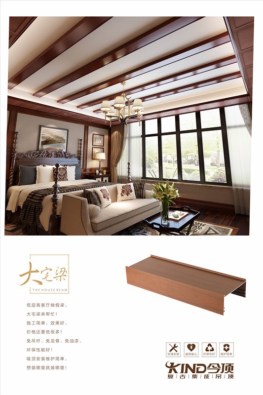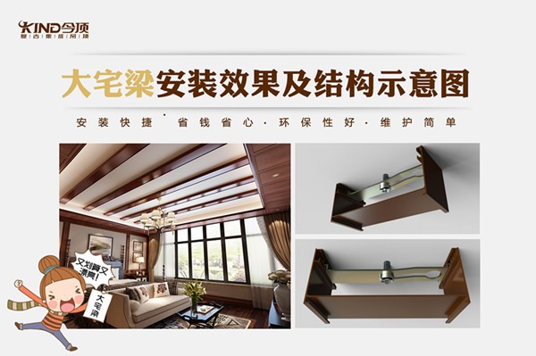 我们如何能够达到做“假梁”的设计效果,让人们省心、省钱又环保呢?今顶集成吊顶2016年春季新品设计元素:大宅梁,让我们花更少的钱,达到更好的效果!今顶大宅梁施工简单,完工效果好,投入费用低,俨然成为假梁的克星。