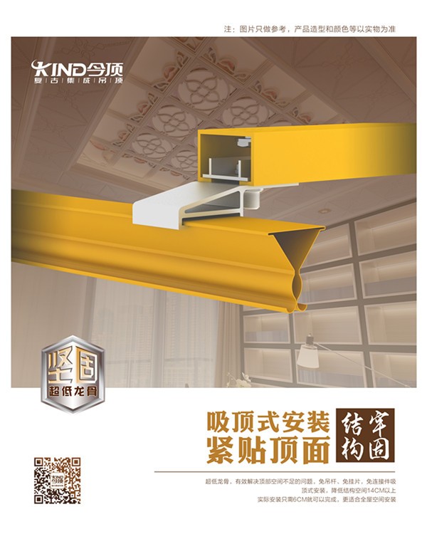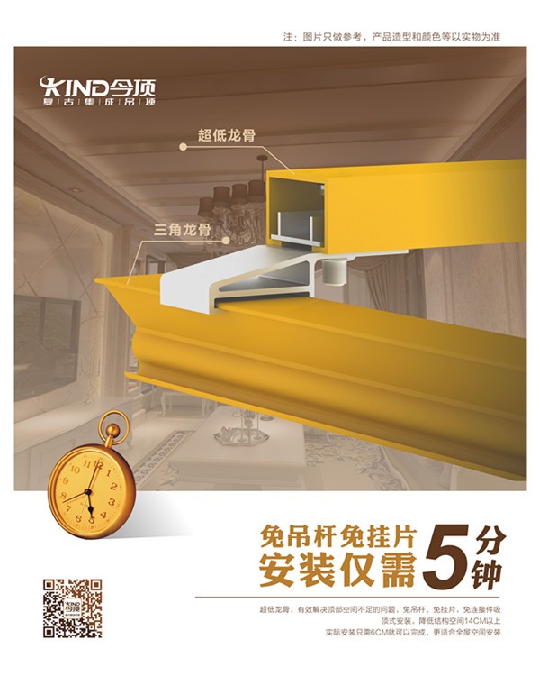 您还在为了安装高度而烦恼吗?今顶超低龙骨,有效解决顶部空间不足的问题,免吊杆、免膨胀管、免挂片,免连接件,吸顶式安装,降低结构空间14CM以上!14CM的空间节省让层高不足的顶部,有了更多室内设计发挥空间。
