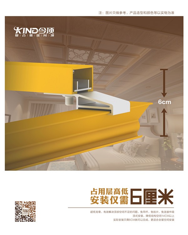 今顶超低龙骨实际只需6CM就可以完成安装,更适合全屋空间安装。其安装快捷,节省层高,结构稳定,自由调节等诸多优点,加快了集成吊顶行业全屋化的脚步。
