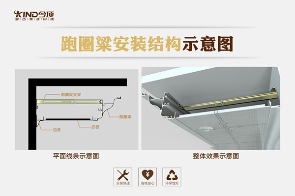 今顶集成吊顶跑圈梁,集集成吊顶所有优点于一身,不用胶,不开裂,不发霉。今顶2016最新板材环保性能好,让家的生活更绿色更舒心更安全!利用今顶独创的跑圈梁支架配合跑圈梁、边条、扣板,实现快速安装,省钱又省心,让家的天空又增添了一份温馨。