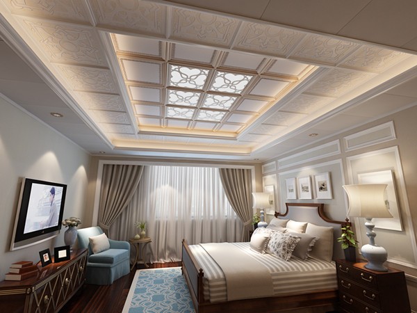 整体方案采用三级吊顶层层递进模式,中央区域采用立体边框造型板和一体错层结构,呈现一种奢华大气的视觉体验。对于卧室而言,最不能缺少的就是浪漫情调,外凸纯白色高分子镶嵌造型的LED照明,为卧室空间增添一抹亮色。