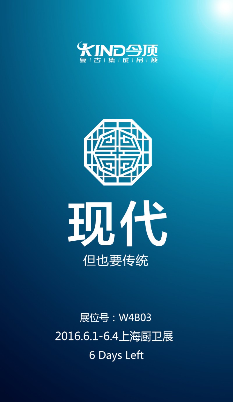 2016年第21届中国(上海)国际厨房、卫浴设施展览会,今顶将用完美的吊顶产品将文化、艺术、生活态度与吊顶更好的融合在一个我们生活的空间,我们不仅仅做产品,更以为消费者提供具有深层价值的消费体验为我们永远的目标!