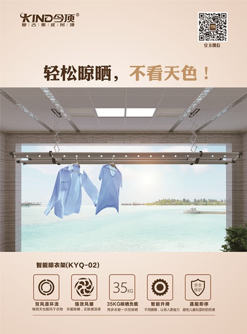 轻松晾晒,不看天色!KYQ-02也具有KYQ-01智能晾衣架的功能:35KG晾晒负载,230cm杆长;智能遥控,穿透障碍物,遥控距离可达15m以上;晾衣架在下降过程中,遇到障碍物自动停止运行!