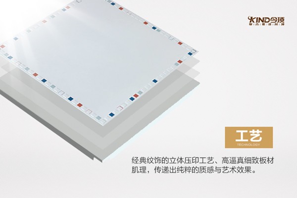 今顶集成吊顶保证完美工艺的同时,安装缜密排布的扣板,不差一丝一豪的切割,天衣无缝的镶嵌,用精湛的技艺打造出匠人该有的精神。卓越的工艺质感,低调中隐现璀璨内蕴,镌刻最华美的工艺乐章。把每件产品当艺术品来雕琢,对细节和完美的无限追求,今顶致力于为消费者带来工艺品般的高品质产品而努力。