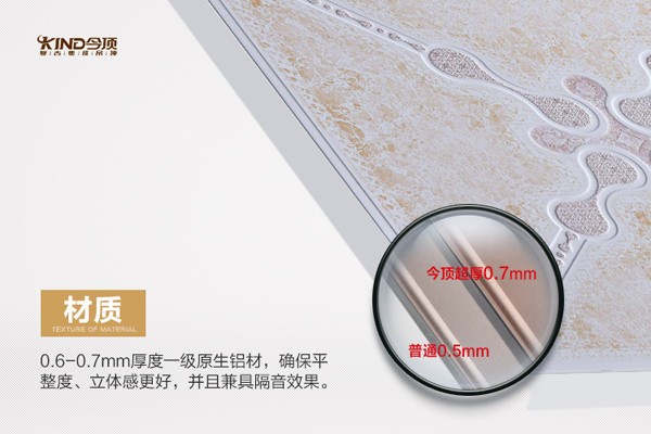 今顶集成吊顶坚定不移的决定在尊雅系列等新品板材上提高板材厚度,增厚至0.7mm,将板材的平整度、立体感增强,隔音效果的改善,极具色彩表现力,让集成吊顶的各项优势都完美体现。而且,板材品质的提升,与瓷砖、卫浴、厨柜等形成统一的风格,档次高、质感好,为消费者带来更加品质化的消费体验。
