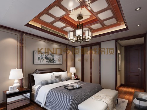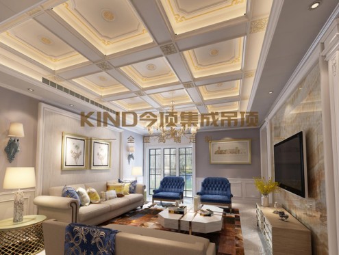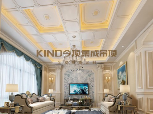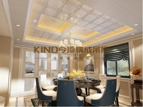 同样是高边款,舍弃与条扣的黄金搭档,拼接常规485X485的纯色板材倒别有一番风味。970刚好是485的2倍,不大不小像是量身定制,结合得没有一丝瑕疵。485板材四周的纹饰真可谓是神来之笔,不经意间的修饰活跃了整个客厅顶面。