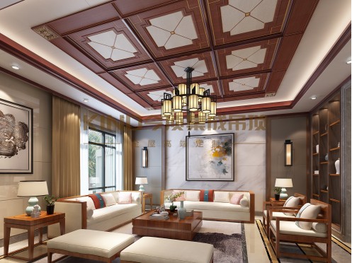 细看条扣将顶面一分为四,中式讲究对称美,每一块板材的点线面以及一整个顶面都在体现这一特点。布艺沙发,与吊顶统一色系,红木色的家具,电视背景墙的水墨画都透着崇尚自然的中式幽静,整体家居氛围体现主人的较高审美情趣与社会地位。