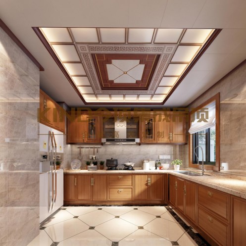 具有中式韵味的原木色彩与纹理环绕“书香门第”,利用与之搭配度极高的板材再次将其环绕,层层叠加的手法将厨房吊顶的精打细磨。沉稳的色彩运用和灵动的纹饰搭配将顶面内容的层次美感表露无遗。