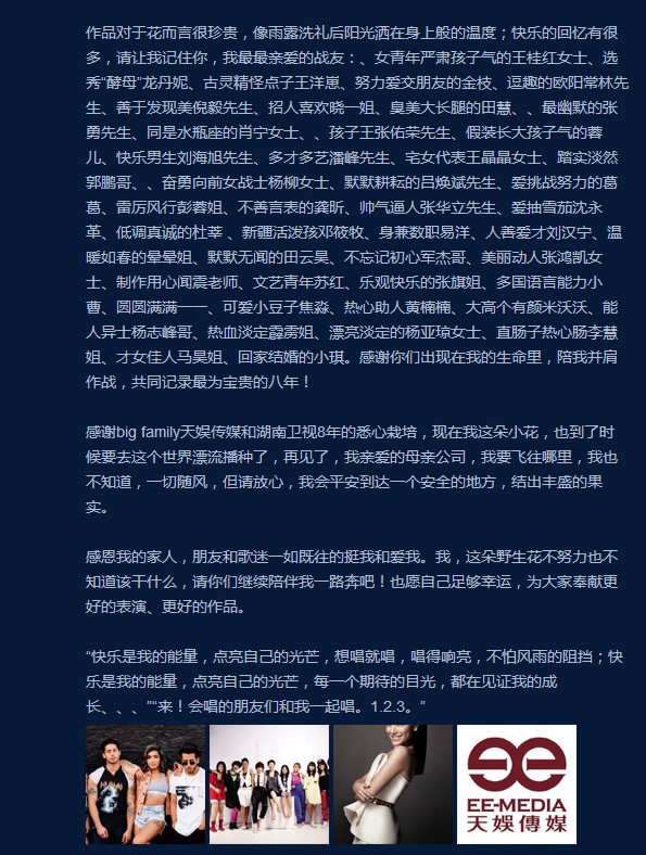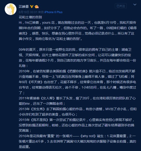 6月19日凌晨,江映蓉在微博发布千字长文宣布自己与天娱传媒八年约满,双方友好结束经纪合约关系,感恩天娱传媒与湖南卫视。