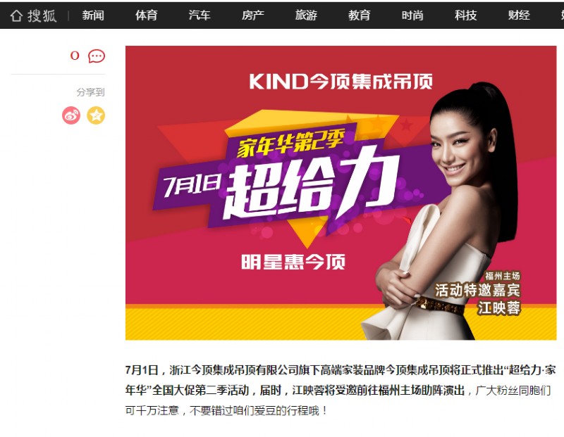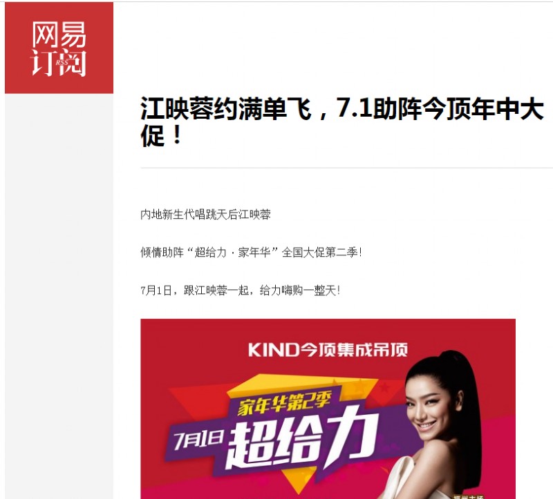 本次年中大促,今顶特别邀请了华语乐坛唱跳皇后,快乐女声总冠军江映蓉助阵福州主场,江映蓉到场后随即接受了嘉宾访问,她表示自己平常就很注重家具乃至装修中的环保健康问题,因而对今顶多有关注,并表达了对今顶产品的喜爱,认为今顶的产品极具质感与品质,传统又经典,非常大气。