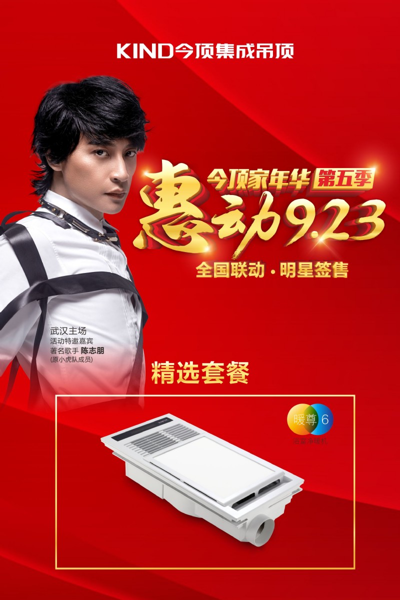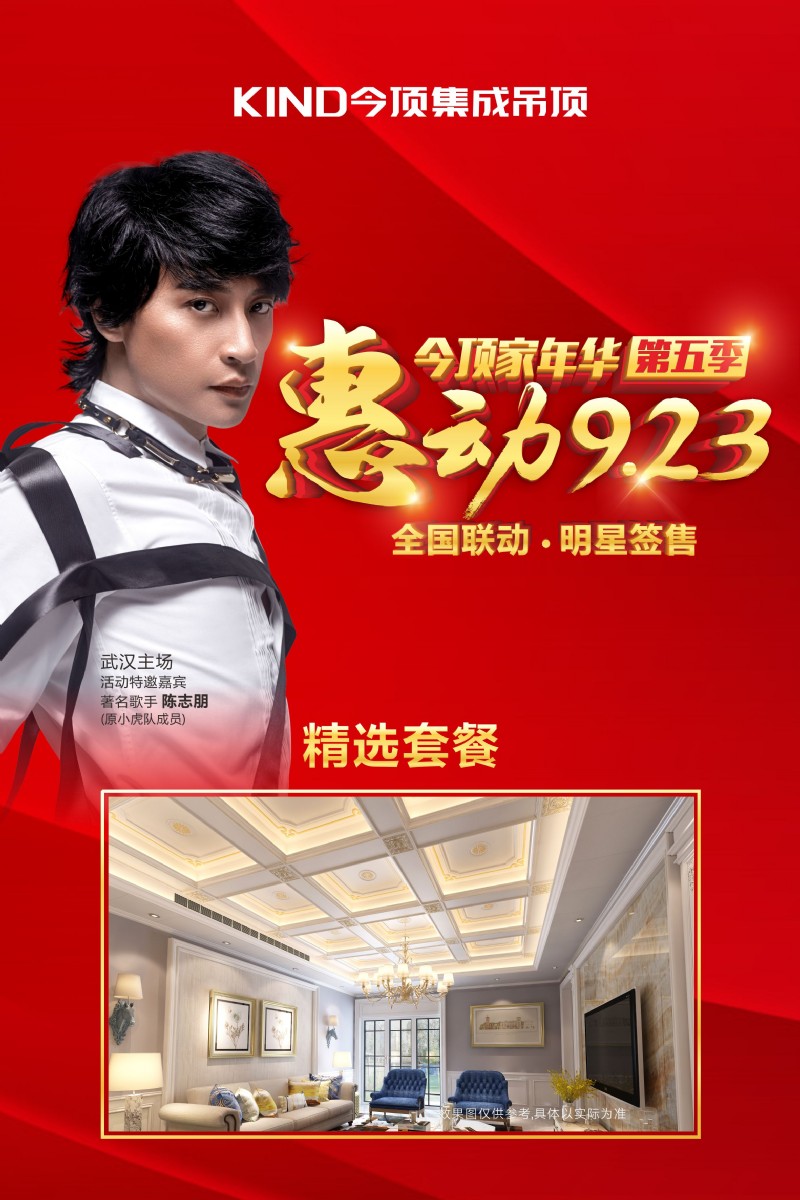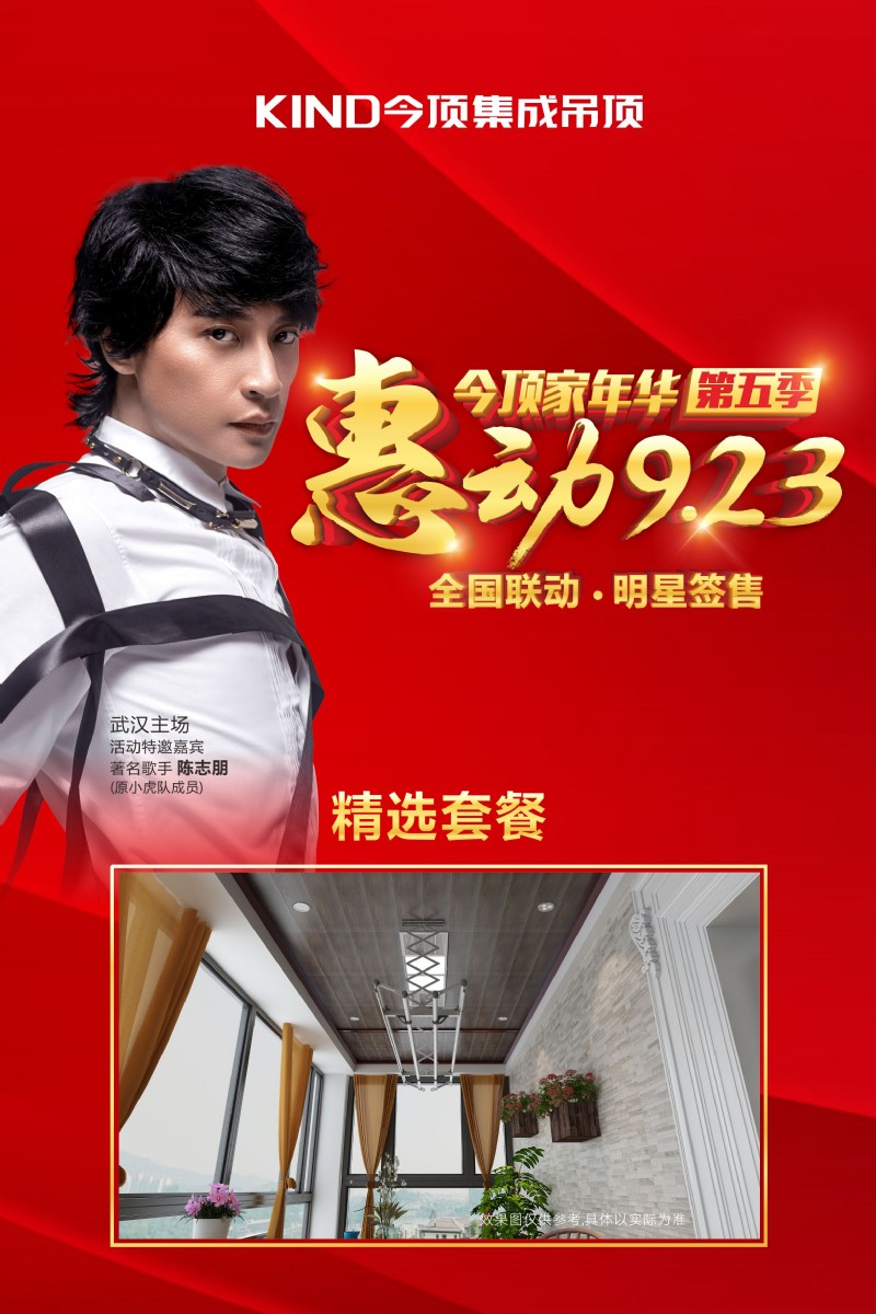 为响应广大消费者的需求,回馈顾客们对今顶的支持与喜爱,今顶集成吊顶将在9月23日,推出“惠动923”今顶全国大促第五季,届时,著名歌手陈志朋将亲临活动主场——武汉汉西红星美凯龙,与你一起嗨翻全场!