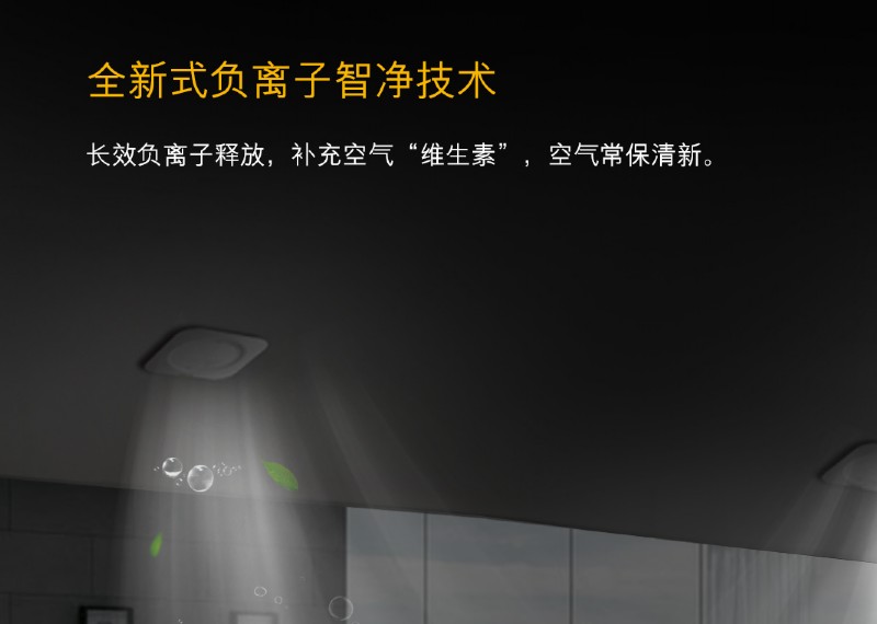 浴室风暖新一代的物理式负离子净化技术,配有长效负离子释放器,能持续抑制卫生间异味,空气净化,一个顶俩!