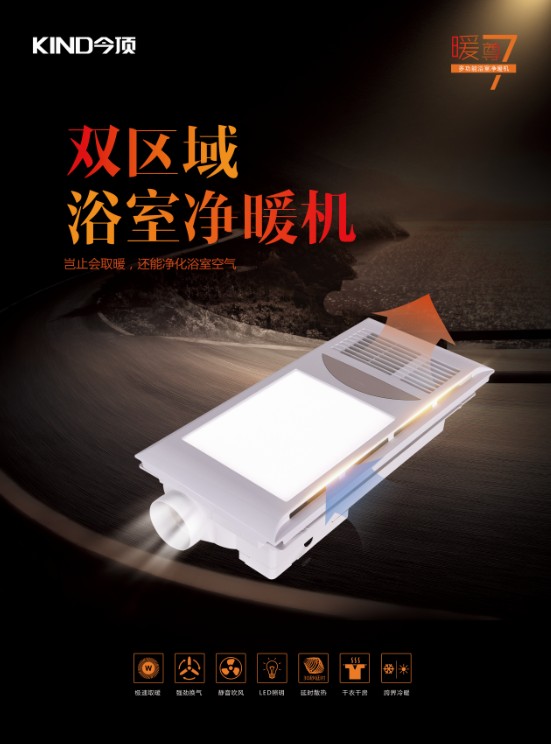 今顶暖尊7通过双电机双核动力、一键切换旋转风门、生态级负离子生成等三大核心技术,实现了LED照明、沐浴暖风、沐浴凉风、洗漱暖风、洗漱凉风、干衣干房、空气净化等10大功能,既是干湿分区跨界的取暖器,又是浴室空气净化器。
