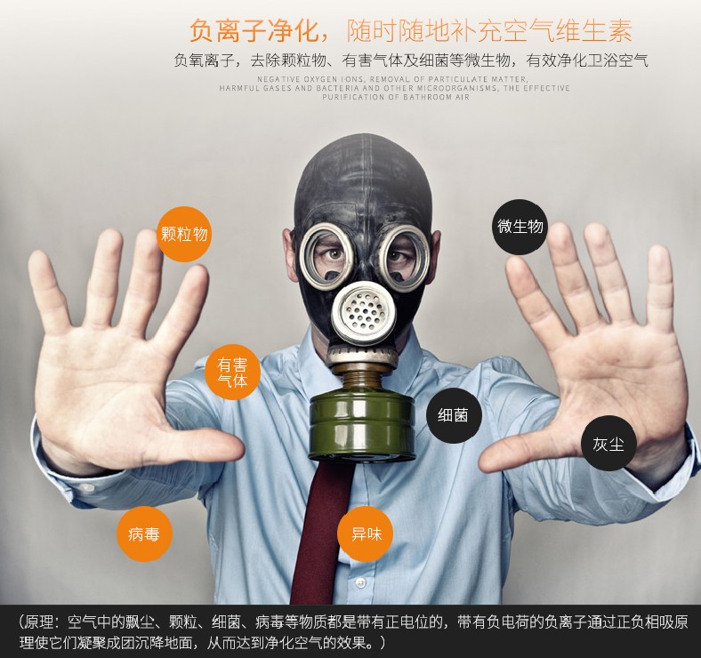 负离子净化,去除颗粒物、有害气体及细菌等微生物,有效净化卫浴空气,随时随地补充空气维生素。