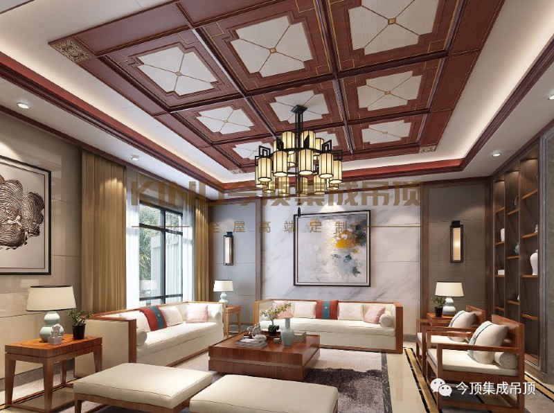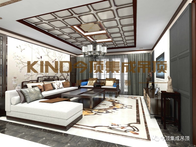 以超大单体规格的“书香门第”为设计核心,结合“天圆地方”、“八方进宝”、“五谷丰登”、“唯美”等众多新中式风格板材,今顶成功打造出了这套“大格局、大面宽”的高价值感吊顶,尊贵奢华的同时,又不失典雅内蕴。