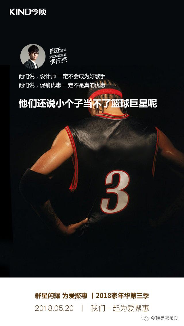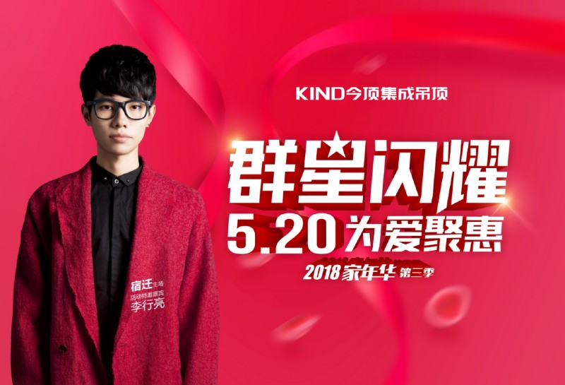 5月20日,今顶又将开启2018家年华第三季“群星闪耀,为爱聚惠”全国大促活动,此次活动将推出预交定金享免费3D设计、群星爆款产品优惠套餐、订单满送活动、砸金蛋抽奖、送花服务等众多优惠活动(具体活动内容以当地门店政策为准),每一项都是实实在在的优惠!与此同时,李行亮也将作为四大嘉宾之一,助阵江苏宿迁,和今顶一起“撕掉标签,活出真我”!