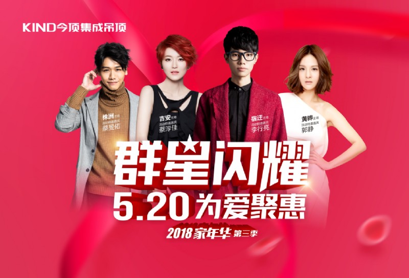为了呼应“群星闪耀,为爱聚惠”的活动主题,今顶本次家年华大促一改以往经典大气的沉稳路线,大手笔邀请了蔡旻佑、蔡淳佳、李行亮、郭静四位歌坛巨星助阵,四位嘉宾或帅气明朗,或甜美静好,完美契合了“520”这一新兴节日的青春活力、浪漫动人;与此同时,四位嘉宾又都是唱功出众的实力派歌手,同样担得起今顶集成吊顶行业领军的优质品牌形象,能与今顶一起为广大顾客奉上最精彩的音乐,最舒适的家装体验!