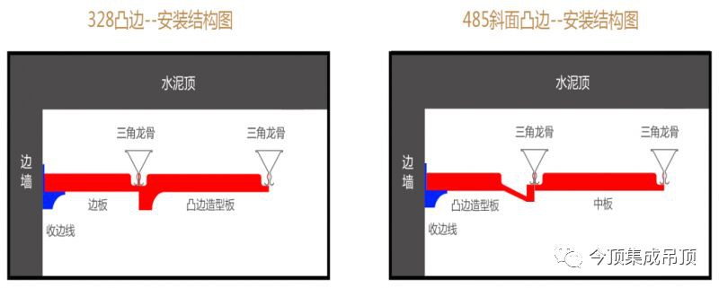 通过凸边造型板的安装(直接卡入三角龙骨,无需任何配件),可以达到1.6cm微错层的落差效果(装饰条落差约0.5cm),在达到同等微错效果的同时,大大节约材料与安装时间成本,适合一般户型层高的客餐、厨卫空间使用。