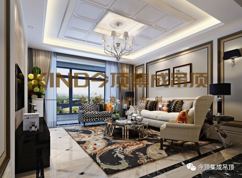 角花造型的装饰模块设计,提升了吊顶文化品质和美学价值,使原本平淡的吊顶形成了独特的艺术环境气氛,让整个天花气氛更活跃。在视觉感受上起到“锦上添花”的作用。