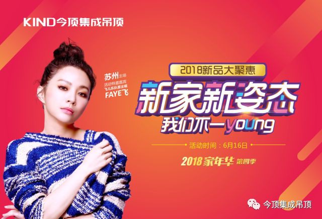 F.I.R飞儿乐团原主唱faye飞,6月16日空降苏州红星美凯龙苏州园区商场,助阵今顶集成吊顶2018家年华第四季“新家新姿态,我们不一young”!率先体验今顶2018春季新品,畅享超低折扣聚惠!