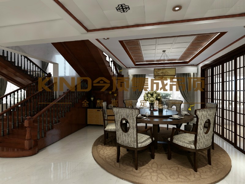 客厅吊顶选用了今顶“1号客厅”系列中的“书香门第”,超大规格板材大气雅致,红棕色泽与深棕色洞窗屏风、棕色大门形成渐变的视觉效果,又有浅色地砖为底,搭配素雅的软装家具,舒适大方,质感别具。