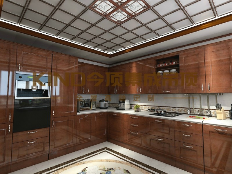 一走进厨房,首先夺去人眼球的就是一整面鲜亮的棕色整体橱柜,为了平衡这大片的橱柜色彩,吊顶选择了白底细边的“天圆地方”,搭配“忆江南”LED造型灯,又利用微错层设计加深了层高效果,有效减少了橱柜的压抑感,整体风格举重若轻,颇有大将之风。
