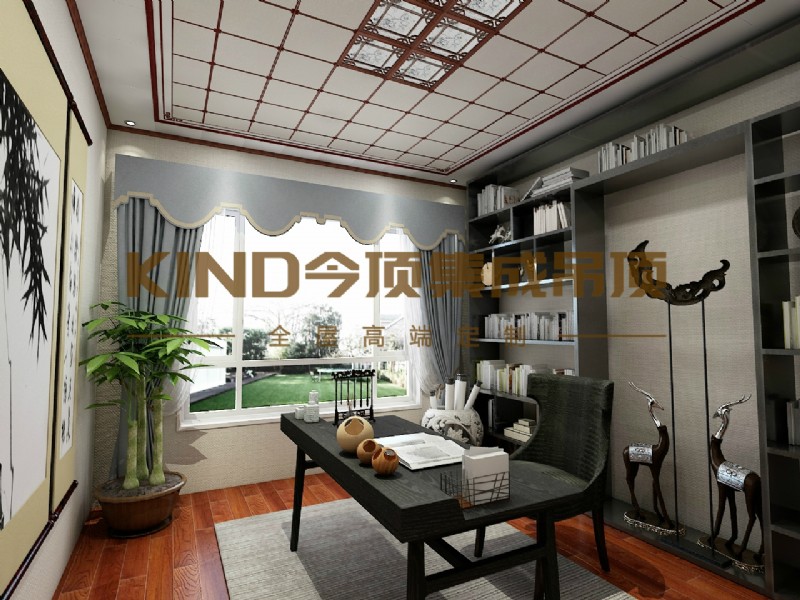 真要说起来,书房绝对是最适合中式风格的居室空间,墙上挂一两幅字画,墙角设一株绿植,桌边摆一套笔墨纸砚,背后是一整墙的书籍,头顶是棋盘造型的“踏雪寻芳”,何等书香,何等惬意?