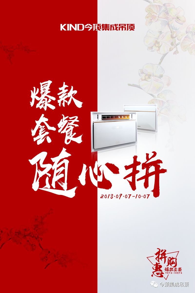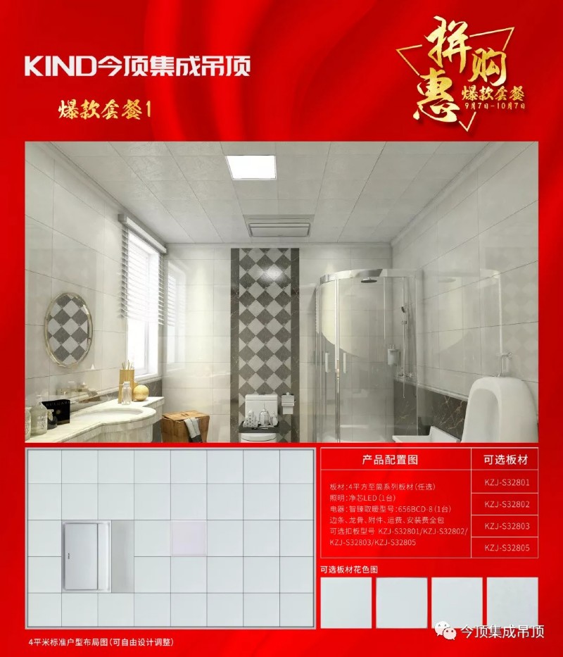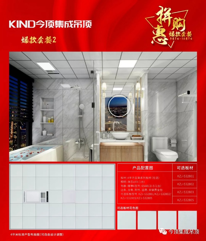 今顶经典热销电器暖霸II,搭配爆款板材“匠韵·罗马假日”和净芯LED方灯,8㎡双倍板材,一次满足厨卫两大空间所需!(详情请咨询全国各地今顶集成吊顶专卖店)