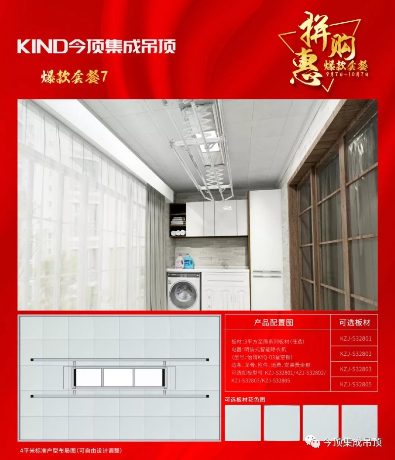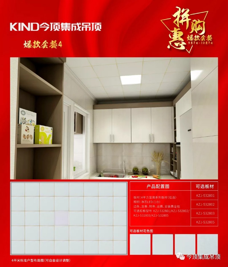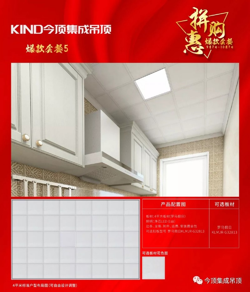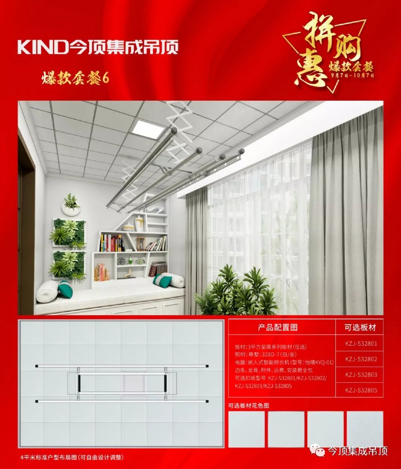 为了最大程度将优惠带给大家,凡是拼购了以上爆款套餐的顾客,如果实际所需板材超过套餐所含面积,还能以活动优惠折扣加购板材!诚意让利,优惠到底!(详情请咨询全国各地今顶集成吊顶专卖店)
