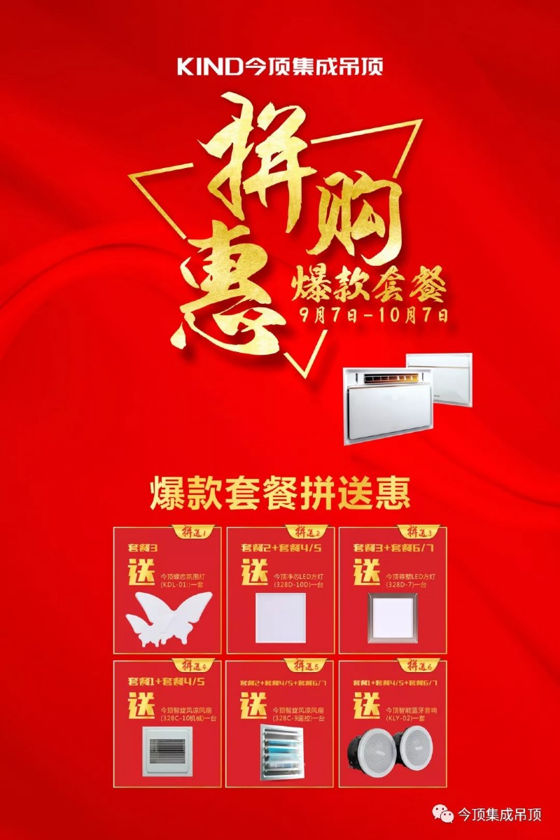 除了拼购惠外,我们还为您准备了额外的拼送惠——拼购不同套餐,可分别获赠今顶蝶恋氛围灯、净芯LED方灯、尊墅LED方灯、智旋风凉风扇、智能蓝牙音响等超值大礼,连环优惠,不容错过!(详情请咨询全国各地今顶集成吊顶专卖店)